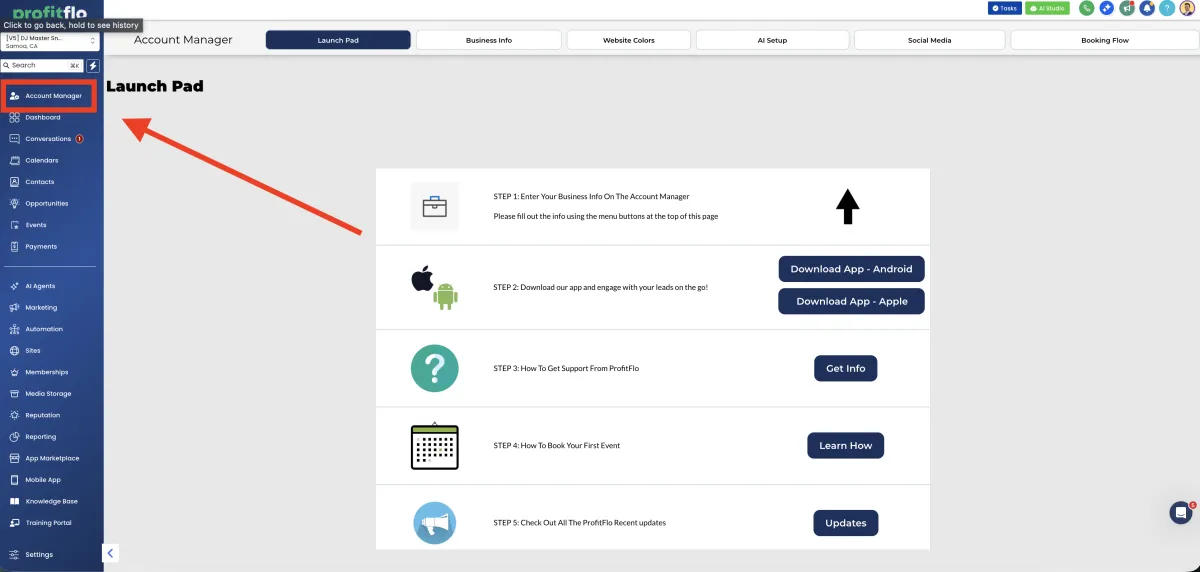 The "Launch Pad" is for all new users. These are the first 5 steps to take when first getting started with ProfitFlo. This will help you launch and learn how to navigate the platofrm with ease.